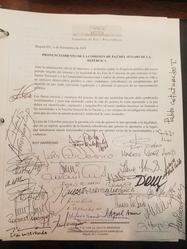 La Comisión de Paz del Senado también instó al presidente Iván Duque y a la comunidad internacional para queden garantías de vida y de ejercicio político a los integrantes del nuevo partido FARC, creado a partir de la firma del Acuerdo de Paz. Los senadores que hacen parte de esta Comisión también hicieron especial llamado a la Fiscalía General de la Nación para que develen la autoría material e intelectual de estas amenazas y atentados. El pronunciamiento fue firmado además de los integrantes de dicha comisión, por senadores de todas las bancadas que tienen asiento en el Congreso.