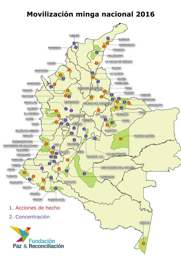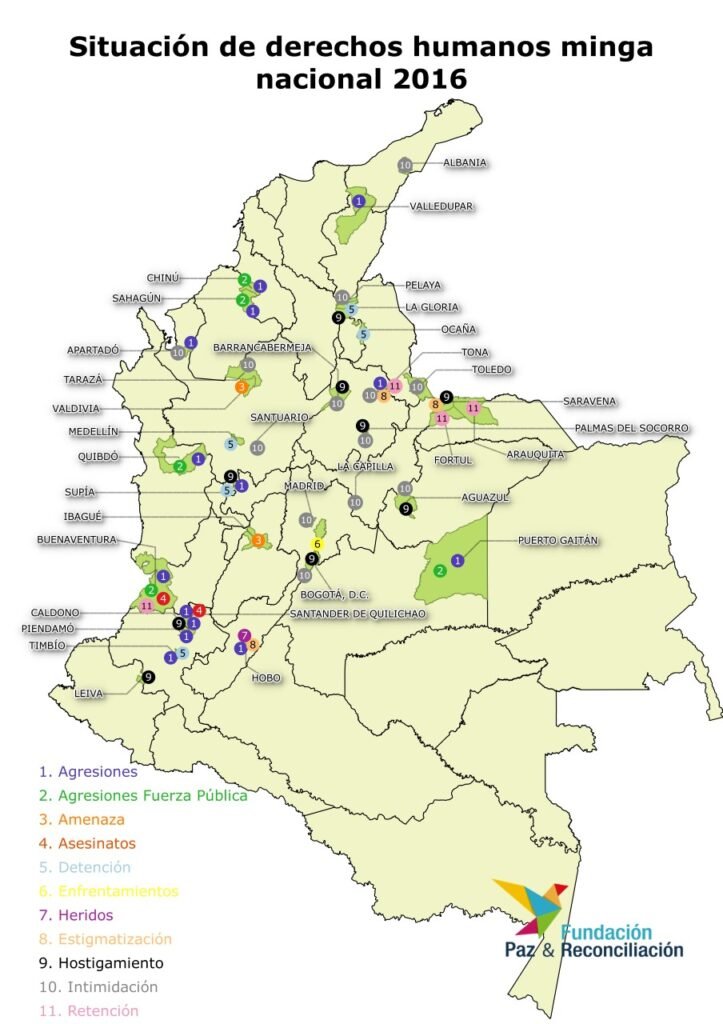 Los pueblos Indígenas reportan 135 heridos; dos indígenas judicializados entre ellos una mujer, 5 retenidas ilegalmente y un desaparecida (ONIC, 2016). Los campesinos y afro han reportado una cifra de 22 heridos, no obstante la cifra es incierta. Se han registrado más de 200 detenciones, además de lo ocurrido el fin de semana en el departamento de Norte de Santander, donde más de 120 campesinos fueron detenidos de manera masiva y dejados en libertad al tras 24 horas.