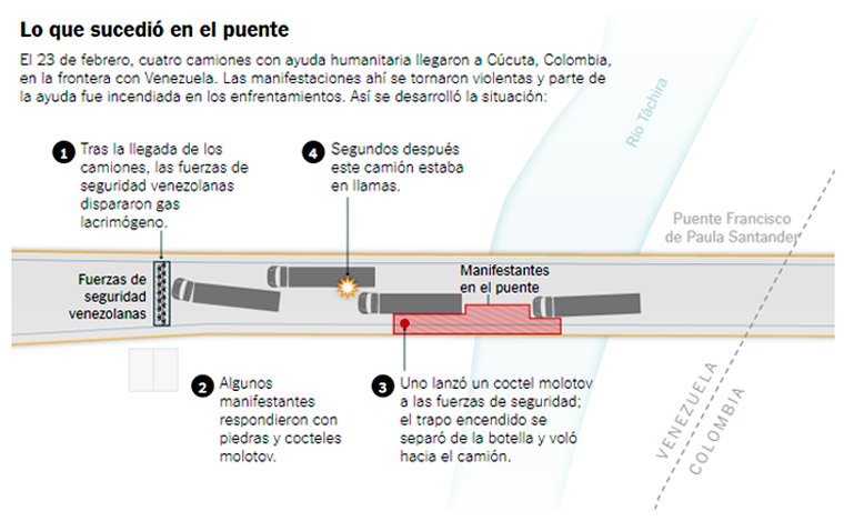 Esta es la ilustración realizada por The New York Times en su artículo, ¿Quién fue responsable del incendio de la ayuda humanitaria para Venezuela?