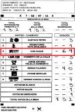 DepartamentoMunicipioZonaPuestoMesaCódigo PDFFavorecidoAntioquia Medellín1223AM-Z1-P2-M23DUQUEAntioquia Medellín1246AM-Z1-P2-M46DUQUEAntioquia Medellín1219AM-Z1-P2-M19DUQUEAntioquia Medellín1217AM-Z1-P2-M17DUQUEAntioquia Medellín1213AM-Z1-P2-M13DUQUE