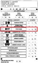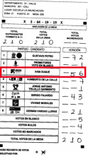 Posteriormente, se encuentra el departamento de Valle, donde dentro de 8 mesas de votación distribuidas en 4 puestos de votación en Cali y Palmira, se encontraron alteraciones parecidas en los formatos E-14 en favorecimiento del candidato Duque.DepartamentoMunicipioZonaPuestoMesaCódigo PDFFavorecidoValle Cali213VC-Z2-P1-M3DUQUEValle Cali2153VC-Z2-P1-M53DUQUE