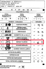 Después, está la ciudad de Bogotá, en donde se encontraron 8 mesas distribuidas en 4 puestos de votación, en las que encontraron alteraciones en favorecimiento del candidato Duque y Fajardo. Sin embargo, conviene subrayar que, de las 8 mesas, solo 2 favorecen a Fajardo.DepartamentoLocalidadZonaPuestoMesaCódigo PDFFavorecidoBogotá Santa librada551B-SL-Z5-P5-M1DUQUEBogotá Santa librada5533B-SL-Z5-P5-M33DUQUEBogotá Santa Marta544B-SM-Z5-P4-M4DUQUEBogotá Santa Marta5419B-SM-Z5-P4-M19DUQUE