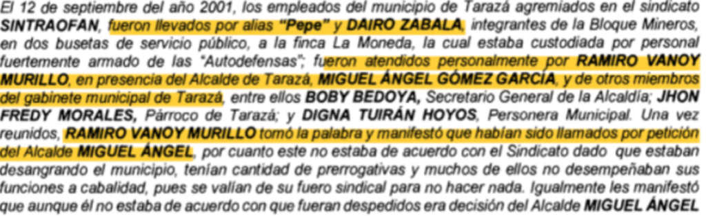 Y el otro proceso estaba ligado a presuntos nexos con grupos armados, específicamente paramilitarismo. Este último se dio en función de los testimonios de Ramiro “Cuco” Vanoy, exjefe de las AUC, quien reveló que Miguel Ángel Gómez, como alcalde de Tarazá, en el año 2001, se benefició de la organización paramilitar en el municipio.