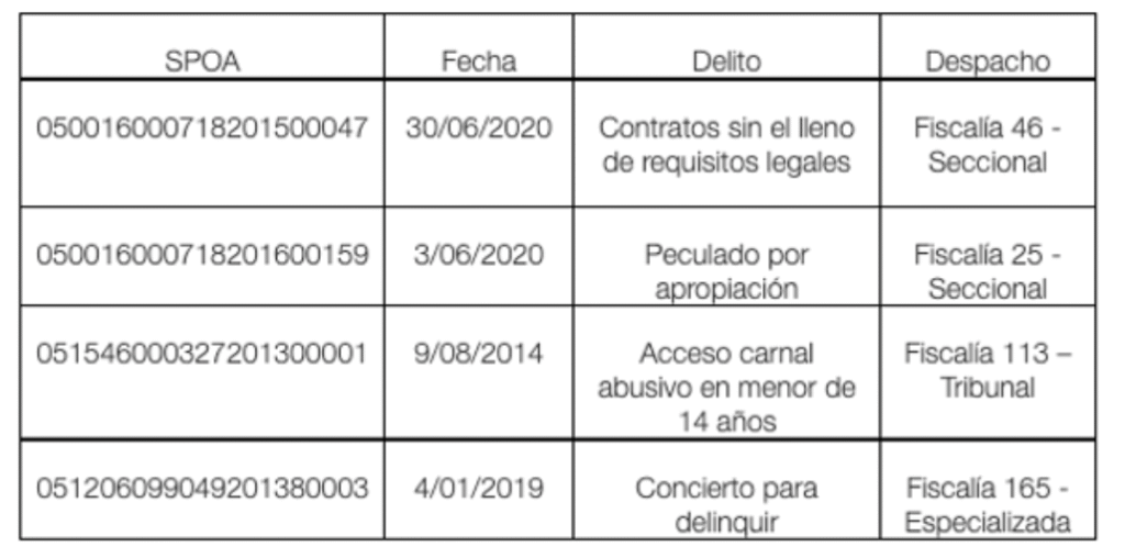 De acuerdo con la investigación llevada a cabo por Mesa, las investigaciones penales que se encuentran activas son las siguientes: