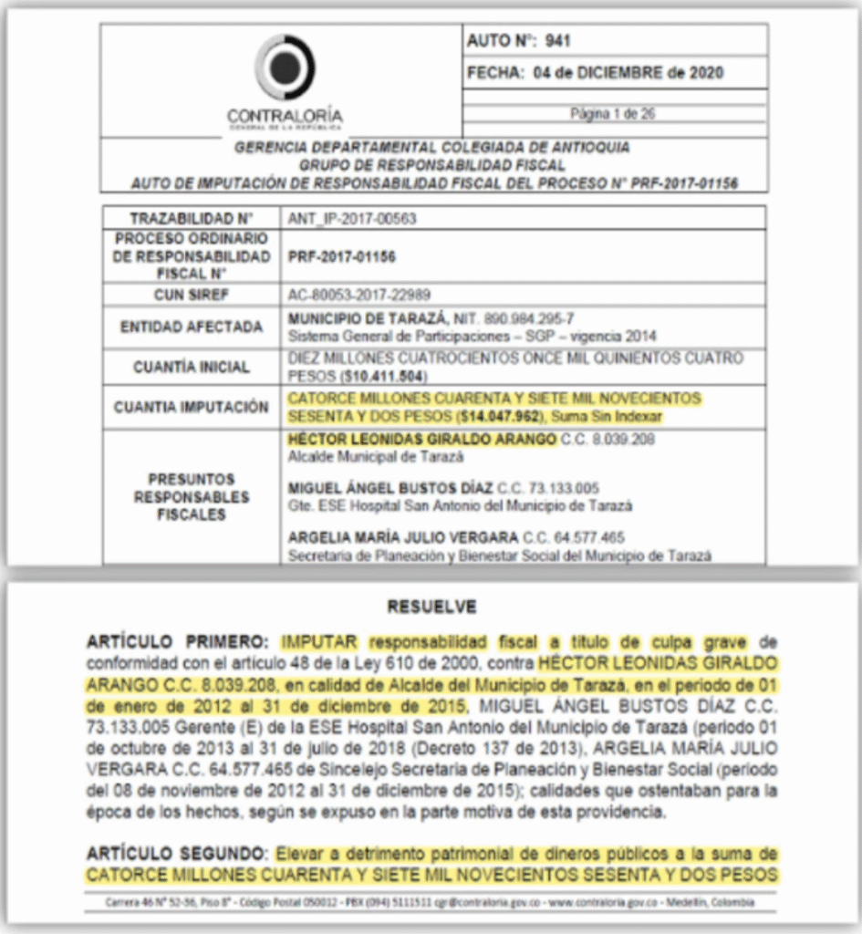 De acuerdo con la investigación de Mesa , “en este proceso también se vinculó a Miguel Ángel Bustos Díaz, ex gerente del Hospital San Antonio, y a Argelia María Julio Vergara, ex secretaria de Planeación y Bienestar Social, quien luego fue gerente del Hospital de Nechí entre 2016 y 2019”.