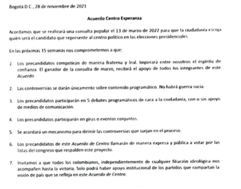 Los integrantes de la Colación Centro Esperanza también acordaron 10 principios programáticos consagrados en undecálogo , los cuales deben ser seguidos por el candidato que quede elegido en la consulta interna de marzo del 2022.