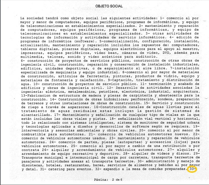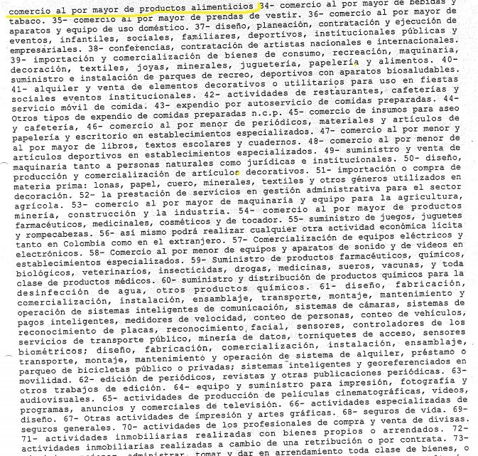 Sin embargo, en su Cámara de Comercio (la cual se encuentra en los documentos adicionales cargados en el Secop), se puede evidenciar que en su objeto social se registran 75 actividades económicas, donde la número 33 hace referencia al comercio al por mayor de alimentos. Por otro lado, al revisar su experiencia en la Cámara de Comercio de Cali, no se encontró ningún contrato asociado al suministro de equipos médicos.
