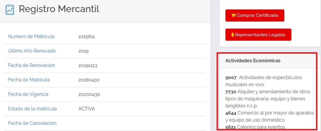 Cuando se realiza la revisión del objeto social de la empresa en el RUES, las cuatro actividades que figuran en el sistema son: “Construcción de otras obras de ingeniería civil”, “Otras actividades deportivas”, “Catering para eventos” y “Comercio al por menor de computadores, equipos periféricos, programas de informática y equipos de telecomunicaciones en establecimientos especializados”, lo cual no corresponde con el objeto de ambos contratos.