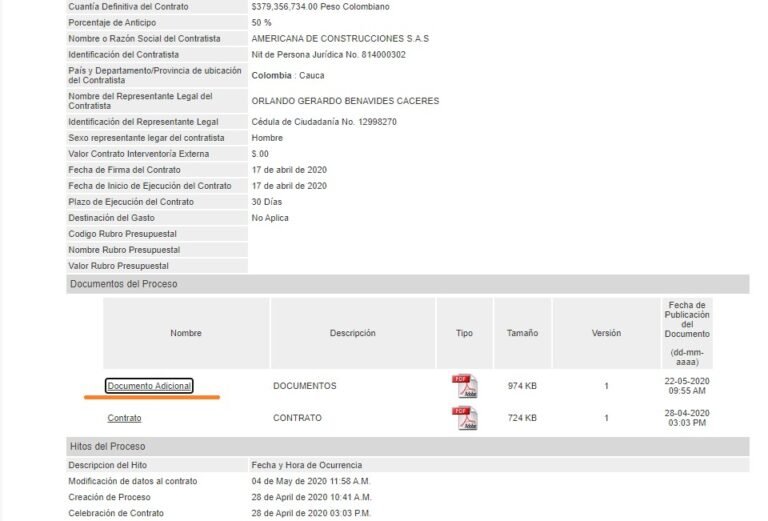 El primero de ellos es un contrato por $225.032.876 pesos, que tiene por objeto la “Compra de suministros hospitalarios para el plan de contingencia ocasionados por emergencia sanitaria del coronavirus (Covid-19)”, mientras el segundo se realizó con el objeto del “Suministro de víveres y abarrotes para tres mil familias vulnerables del municipio de Villa Rica, Cauca por emergencia sanitaria del coronavirus (Covid-19)” por un valor de $270.000.000 pesos.