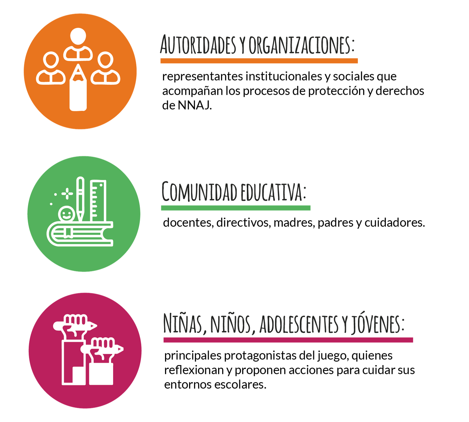 Cada tipo de jugador aporta su mirada y experiencia para comprender los riesgos, construir soluciones y fortalecer el trabajo conjunto por escuelas más seguras.