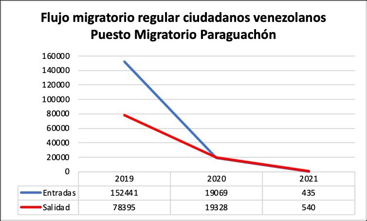 Este cambio en la dinámica de la migración se vio reflejado en las cifras de recepción y salida de todos los puestos migratorios entre Colombia y Venezuela. En el Puesto Migratorio de Paraguachón, corregimiento del municipio de Maicao y que conecta el departamento de La Guajira con el estado del Zulia, las entradas de ciudadanos venezolanos en 2020 se redujeron en un 87,5 %; mientras que las salidas se redujeron en un 75,3 %, ambas cifras en comparación con 2019.