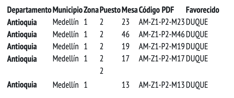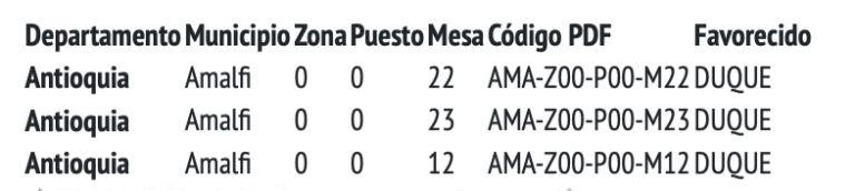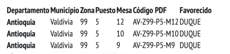 Los municipios de Amalfi, Valdivia y la ciudad de Medellín es donde existen más casos de varias mesas en las que hubo patrones identificados. Se trata de 11 mesas distribuidas en 3 puestos de votación en los que hubo modificaciones de más de 100 votos en favorecimiento del presidente electo Iván Duque.