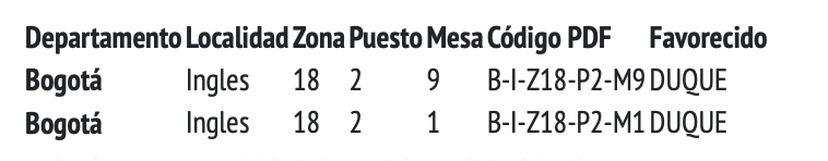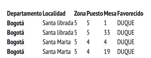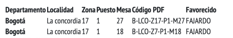Después está la ciudad de Bogotá, en donde se encontraron 8 mesas distribuidas en 4 puestos de votación, en las que hubo alteraciones en favorecimiento del candidato Duque y Fajardo. Sin embargo, conviene subrayar que, de las 8 mesas, solo 2 favorecen a Fajardo.