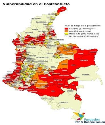 El siguiente mapa muestra la vulnerabilidad de los 281 municipios más afectados por la violencia. Está vulnerabilidad se refiere a las probabilidades de que estas regiones vivan una nueva ola de violencia luego de la firma de la paz y de la capacidad del Estado local para aplicar los acuerdos firmados. Tal vez uno de los retos más grandes es crear las condiciones necesarias para que los campesinos en varias regiones del país salgan de las economías ilegales.