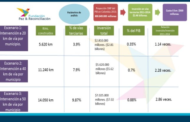 La Fundación Paz y Reconciliación ha realizado un estudio sobre esta materia. Prácticamente en los 281 municipios más afectados por el conflicto el sistema vial está destruido. La mayoría de las intervenciones se han hecho en Cundinamarca, Boyacá, Santander y algo en el Cauca y Antioquia. Así que el esfuerzo en estas zonas de color rojo debe ser inmenso. Económicamente el costo no es alto, depende más de voluntad política. Pere efectivamente se requiere aumentar los gastos en este tipo de vías.
