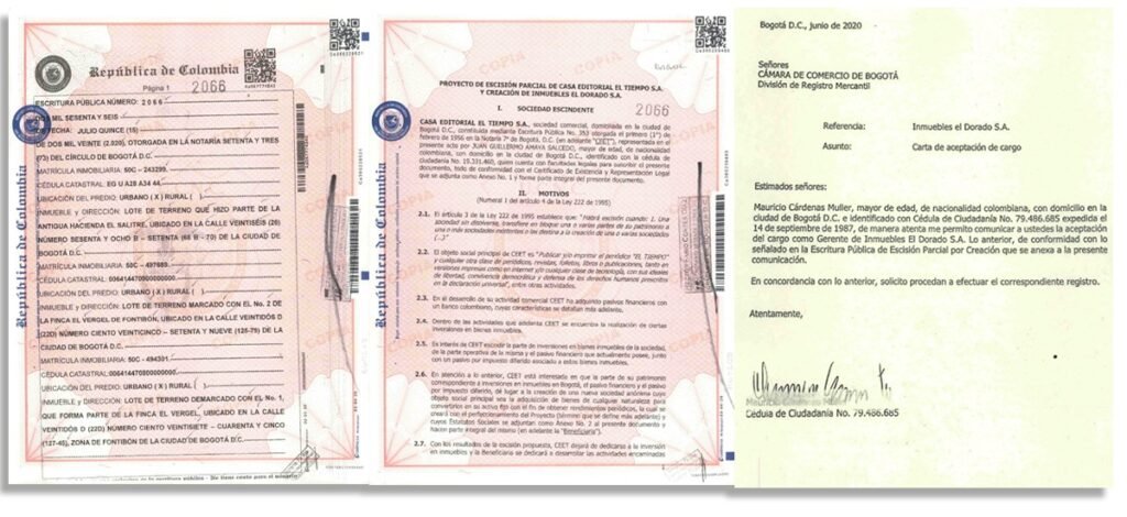 La descapitalización de Casa Editorial El Tiempo S.A. y la consiguiente creación de Inmuebles El Dorado S.A. está ilustrada en 268 folios de la correspondiente escritura pública del traspaso de los bienes. Es la 2066, del 16 de julio de 2020, sentada en la Notaria 73 de Bogotá.