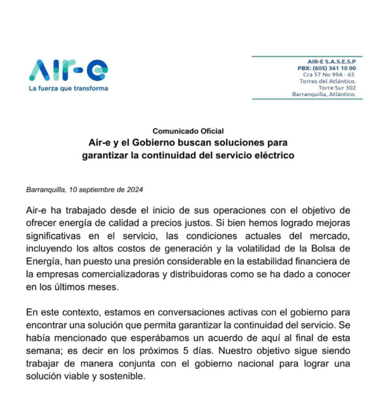 LaRazon.co. (2024, 10 septiembre). Air-e solicita intervención del Gobierno ante crisis financiera –LARAZÓN.CO.LARAZÓN.CO – Diario de noticias y actualidad en Colombia y el mundo.https://larazon.co/region/air-e-solicita-intervencion-del-gobierno-ante-crisis-financiera