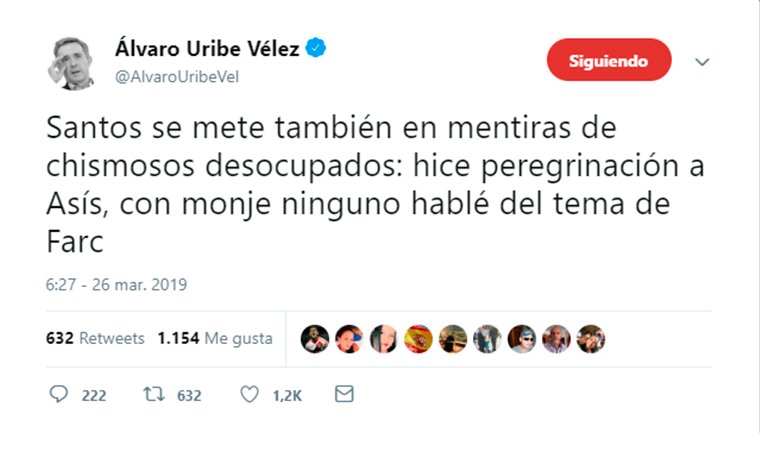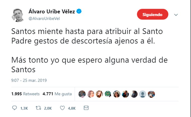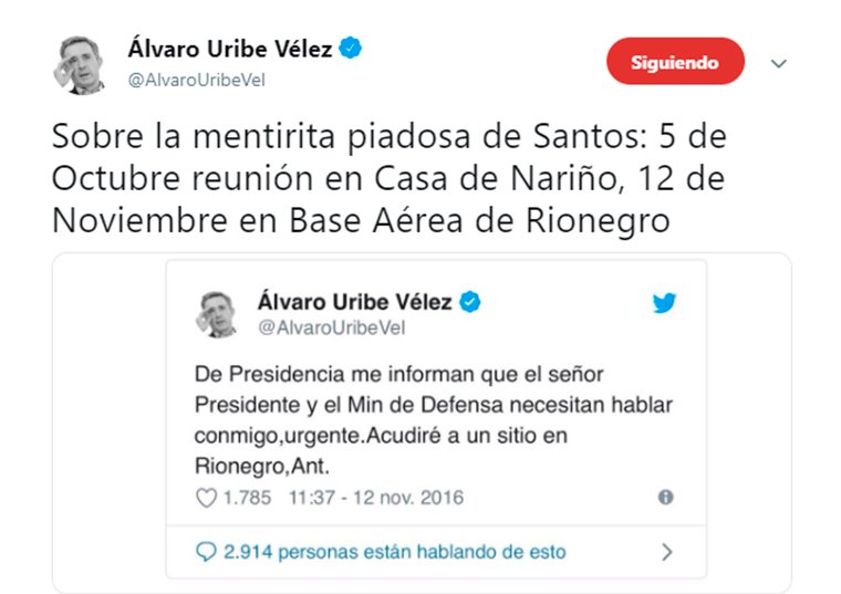 “Mentirita pero leve (de) Santos: primera vez que lo vi después del Plebiscito fue en Casa (de) Nariño, reunión q pedimos. En la Base Aérea fue después, seguramente hablé (de) Arias, mi deber, rogué, vanamente, que en lugar de firmar esa tarde con Farc en La Habana se buscara el acuerdo Nal”, contrarrestó Uribe desde el sábado en su cuenta de Twitter con otra seguidilla de trinos.