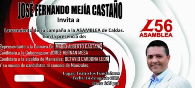 Según el informe, el candidato a ocupar la Registraduría caldense fue José Fernando Mejía Castaño, quien para ese momento gozaba de estrechos vínculos con el senador caldense. José Fernando fue candidato a la Asamblea departamental de Caldas por el Partido Liberal en el 2016, pero los votos conseguidos no fueron suficientes para que se quedara con la curul. Luego del fallido intento, Mejía fue el director del Invama en Manizales, encargado por el alcalde electo José Octavio Cardona León, también respaldado por Mario Castaño.