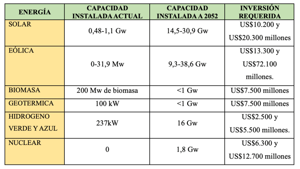 El costo de la Transición Energética resulta ser una cifra bastante significativa al bolsillo, según los informes socializados por el Foro Económico Mundial el país requiere contar, aproximadamente, con US$122.000 millones para poder lograr cubrir las proyecciones gubernamentales hasta 2052. Si bien, la capacidad instalada, a partir de cada energía, tiene un costo en particular y requiere verse desde la perspectiva actual y las proyecciones a treinta años para poder garantizar el logro: