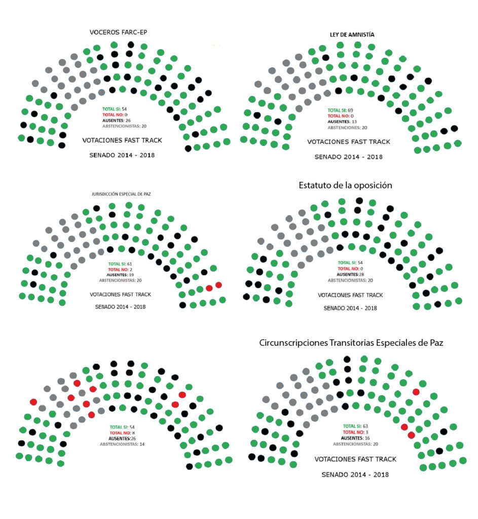 Durante el primer semestre del año 2017, fueron aprobados en bloque, antes de la regulación de la Corte Constitucional, enFast Track : cuatro actos legislativos (JEP, Reincorporación, Estabilidad Jurídica del Acuerdo y Monopolio de las Armas); dos leyes orgánicas (Voceros FARC-EP y UNP); una ley ordinaria (Amnistía), y una ley estatutaria (Estatuto de la Oposición).