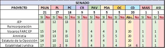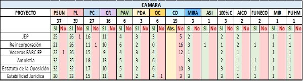 A continuación, se presenta de manera gráfica las votaciones para cada uno de los proyectos que tienen relación directa con la implementación y realización del Acuerdo de Paz firmado entre el Gobierno Nacional y las Farc- EP.
