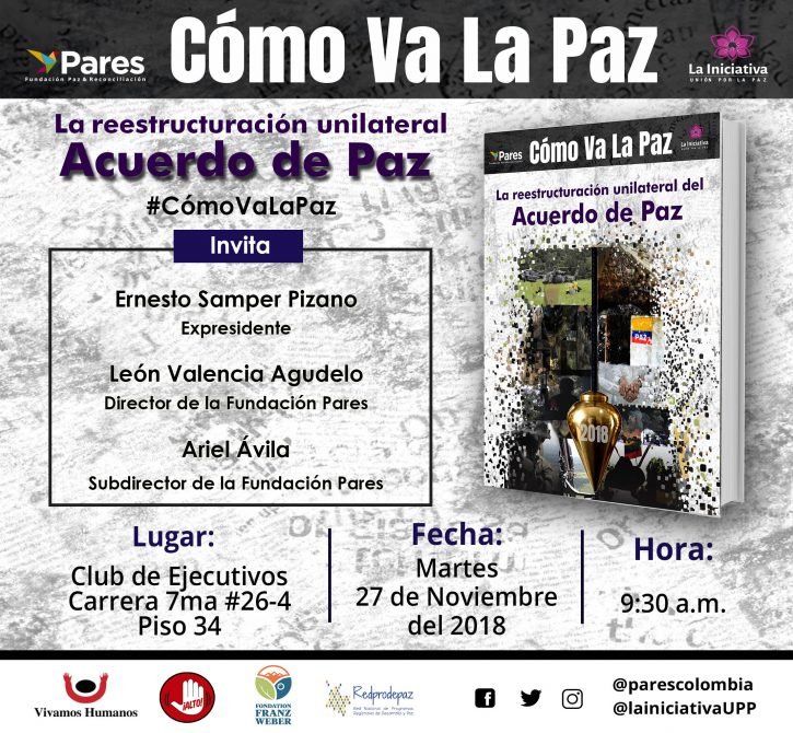 Tras varios meses de trabajo, el 27 de noviembre de 2018 la Fundación Paz & Reconciliación y La Iniciativa Unión por la Paz presentarán su informeCómo va la Paz: la reestructuración unilateral del Acuerdo de Paz . En este sexto informe sobre el seguimiento a la implementación de lo acordado se hace un balance a dos años de la firma en el Teatro Colón y a 100 días del inicio del gobierno de Iván Duque.