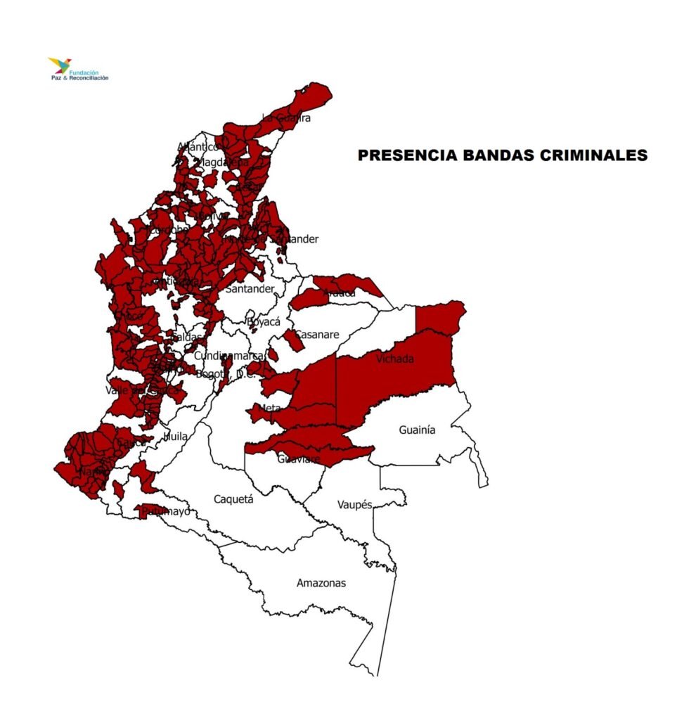 Sobre la presencia de las Bandas Criminales en el territorio nacional hay distintas valoraciones en la Policía, la Fiscalía y las organizaciones no gubernamentales. La Fundación Paz y Reconciliación ha detectado actividades de estas fuerzas en 275 municipios de 27 departamentos. En una entrevista con una persona ligada de mucho tiempo atrás a las Autodefensas y conocedora de primera mano de los Urabeños, decía que esta banda criminal estaba organizada de la siguiente forma: un primer núcleo conformado por 50 comandantes vinculados de manera estrecha con Dairo Usuga, alias Otoniel. Después 2900 integrantes que componen la fuerza directa y propia de los Urabeños y luego nexos y alianzas con diversos grupos que pueden tener 12.000 integrantes. Estos números se pueden prestar para muchas discusiones. Hay, desde luego, una volatilidad enorme de estos grupos por las capturas, las muertes y las disoluciones de estructuras, pero lo que está plenamente demostrado es que el número y la extensión de los Bandas Criminales exceden bastante los cálculos que tiene la Fuerza Pública que registra unos 4900 miembros en estas organizaciones.