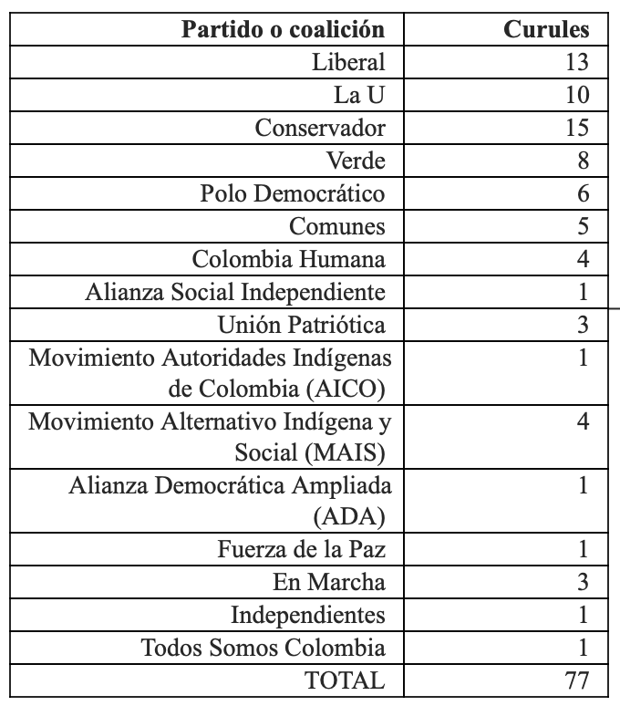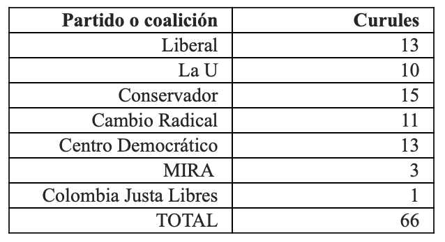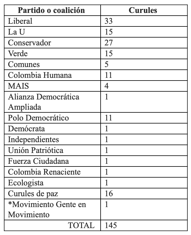• De 187 representantes (incluyendo las 16 curules especiales de paz), 145 pertenecen a la coalición de gobierno.