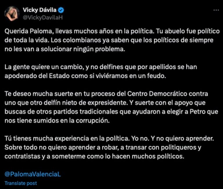 Por ahora, y como lo señalábamos en este artículo, Vicky Dávila está aprovechando su postura antipolítica y el fenómeno Trump para poder articular en su discurso a estas nuevas derechas que están buscando una figura con carisma y capacidad de articulación entre diferentes sectores para construir una narrativa unificada y un programa viable y amplio hacia 2026, pero aún no genera suficiente consenso para atraer a estos mismos sectores de la política que cuestiona y critica.