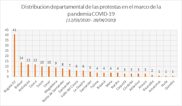 De acuerdo con la información registrada por PARES, a 47 días de la declaratoria de emergencia sanitaria se han presentado 173 protestas en 24 departamentos del país, lo que quiere decir que estas acciones han ocurrido a un ritmo promedio de 3,7 por día. En un artículo reciente, Ignacio Ramonet define a la pandemia de COVID-19 como un “hecho social total”; un fenómeno que convulsiona “el conjunto de las relaciones sociales, y conmociona a la totalidad de los actores, de las instituciones y de los valores”.