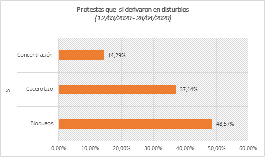 De acuerdo con los datos analizados, tan solo en un 20,23% de los casos registrados se presentaron disturbios o choques con la fuerza pública. En la contracara, las protestas en donde sí se presentaron disturbios, en su mayoría derivaron de aquellas que utilizaron los bloqueos como estrategias de movilización, abarcando el 48,57% de los casos que sí registraron violencia.