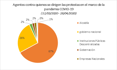 Finalmente, las protestas se han dirigido principalmente en contra del poder ejecutivo. Cerca del 93% de los hechos registrados, equivalen a protestas en contra de alcaldías (67%) o de medidas derivadas de acciones u omisiones del gobierno nacional (26%). A estos dos actores le siguen los hospitales (instituciones públicas descentralizas) y gobernaciones. En la siguiente gráfica se evidencia esta distribución: