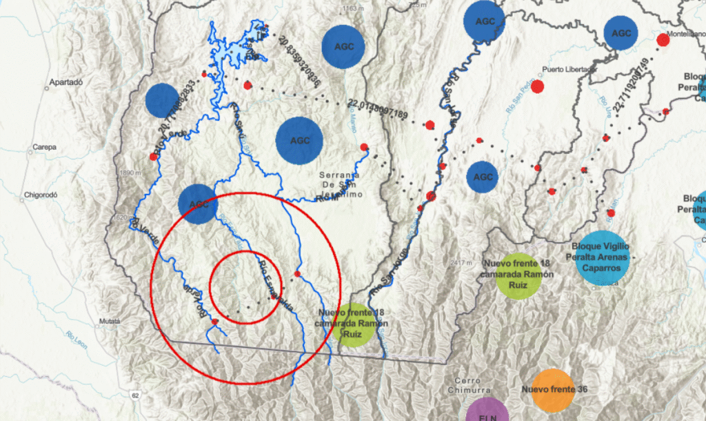 1. Al noroccidente, en los corregimientos de Saiza y Crucito, y la vereda Naín, puntos que sirven como retaguardia de AGC – Clan del Golfo para atender a combatientes heridos y para refugiarse. Mediante estos puntos se conectaba a Urabá, su segundo bastión en donde tenía redes familiares que servían como sus fuentes humanas, por el río Verde. Este trayecto no le tomaba más de 3 horas y estaba protegido por los 4 anillos, a excepción del urbano.