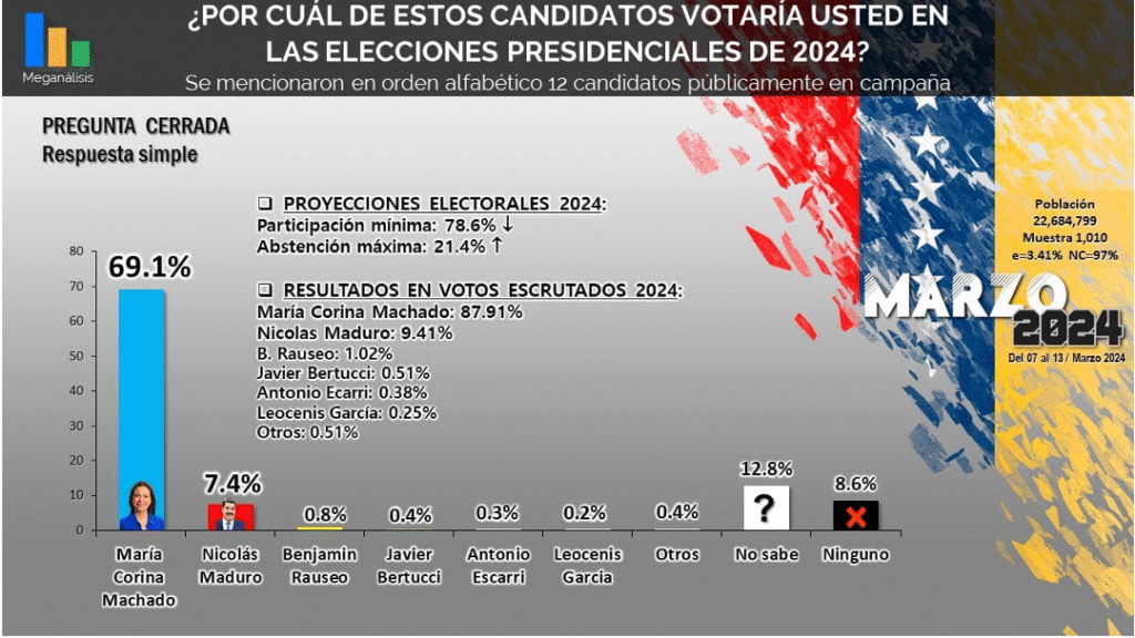 La última encuesta que midió las tendencias electorales en Venezuela la realizó Meganálisis entre el 7 y el 13 de marzo de 2024. En ella, María Corina Machado resultó ganadora con el 69,1% de la intención de voto medida, mientras que Nicolás Maduro obtuvo solamente un 7,4%. Aunque Antonio Ecarri y Benjamín Rausseo, candidatos independientes, no suman más del 1%, junto con el otro 1% de otras candidaturas medidas por la encuesta, las razones por las cuáles se lanzan por fuera de las toldas de la oposición o el oficialismo se vuelven importantes para entender la fragilidad de la Plataforma Unitaria (PUEDE), que sin la candidatura de Machado ya denota ciertas fisuras internas, del mismo modo para saber a dónde se van a ir los votos de la gente que en las encuestas ha manifestado no apoyar a ningún candidato o abstenerse de participar, cuya cifra se ubica sobre el 20%. Es decir, 1 de cada 5 venezolanos no tiene un candidato definido o no quiere participar abiertamente en el proceso electoral.