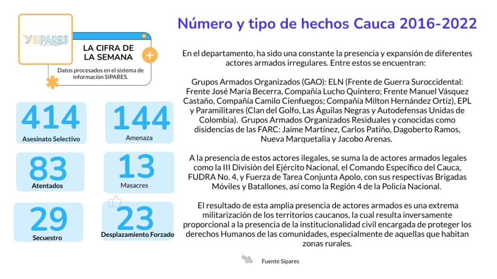 La cifra de la semana está centrada en el Cauca. Enero lo cerramos conun crítico balance sobre la situación de violencia en este departamento. Con al menos 18 hechos, el país conoció de vulneraciones a liderazgos sociales, indígenas, jóvenes, población civil y fuerza pública. Es por ello que, desde el Sistema de Información de la Fundación Paz & Reconciliación, SIPARES, recogimos datos sobre la situación de este territorio. Por ejemplo, desde 2016, se han presentado 414 hechos asesinatos selectivos. Conoce más en estas infografías.