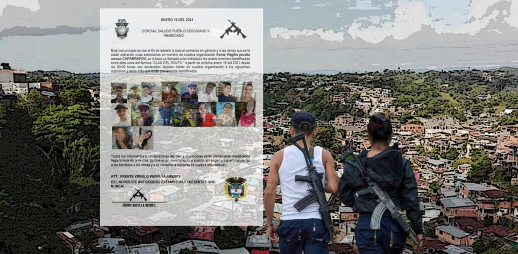 En el panfleto se lee: “Este comunicado es con el fin de advertir a todo el comercio en general y a las minas que se le están cobrando por extorsiones en nombre de nuestra organización frente Virgilio Peralta Arenas Caparrapos, se hace un llamado a los individuos los cuales tenemos identificados, entre ellos unos del famoso Clan del Golfo, que a partir de la fecha enero 16 del 2021 desde las 00:00 horas son declarados objetivo militar de nuestra organización a los siguientes individuos y otros más que están plenamente identificados. Todos los informantes y colaboradores del Clan (del Golfo) y Libertadores están plenamente identificados. Llega la hora de la verdad, porque están desangrando el pueblo, les pagan y siguen mandando a los bandidos a las minas y al comercio a nombre de nuestra organización”.