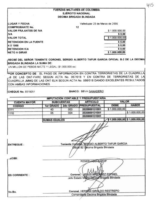Documento en el que aparece la firma de Martínez Espinel que certifica el pago de 1.000.000 de pesos a un informante que fue clave en una operación donde resultaron asesinados una niña y un hombre indígenas.
