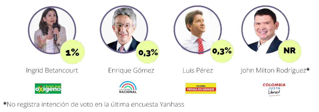 Íngrid Betancourt, se cerró la puerta de la Coalición Centro Esperanza, después de haber elevado su autoridad moral sobre los intereses colectivos de la coalición de centro. Por su parte, Enrique Gómez y John Milton Rodríguez se enfrentan a una difícil contienda electoral, en la que según la más reciente encuesta, ambos se encuentran lejos de alcanzar el margen de error. Esto quiere decir que estos candidatos tendrán que tomar la decisión de continuar o apartarse de la competencia, para suscribir acuerdos con los candidatos llamados a pasar a la segunda vuelta. De hecho, en la coalición Mira – Justa Libres, la mayoría de los congresistas elegidos ya han mostrado su respaldo a la candidatura de Federico Gutiérrez.