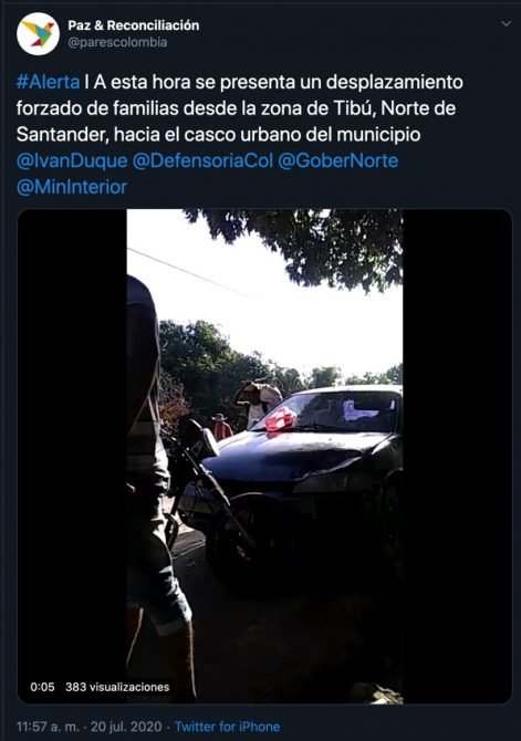 Tras la masacre perpetrada en el corregimiento Carboneras —en la vereda conocida como Totumito-Carboneras— de Tibú, el país conoció las imágenes del desplazamiento forzado de las familias que componen algunos corregimientos de zona rural de Tibú, Norte de Santander, hacia el casco urbano del municipio. Entre otras cosas, Tibú es el municipio donde más asesinatos se han registrado en contra de líderes y lideresas sociales. Según cifras Pares, el 7,2 % de los hechos victimizantes han ocurrido allí.