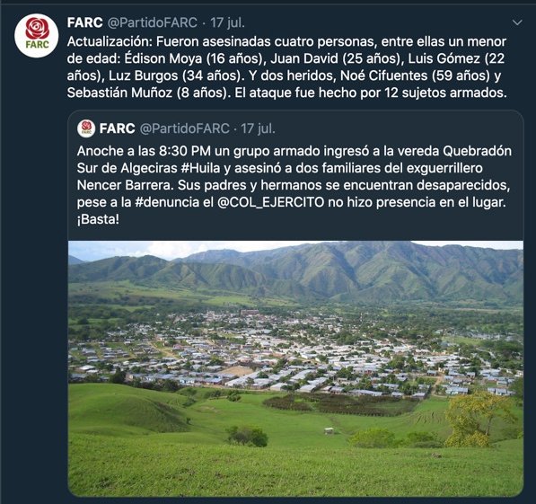 La Masacre en Algeciras el pasado 16 de julio de 2020, en donde fueron asesinadas cuatro personas. Vecinos y una familiar —cuñada— de Nencer Barrera, firmante de paz quien trabaja como escolta en la Unidad Nacional de Protección. Tal como las comunidades le dijeron a Pares que los hombres armados, tras la masacre, amenazaron contra la población diciendo que la idea era “acabar con toda la familia Barrera e incluyendo las familias de las otras víctimas”.