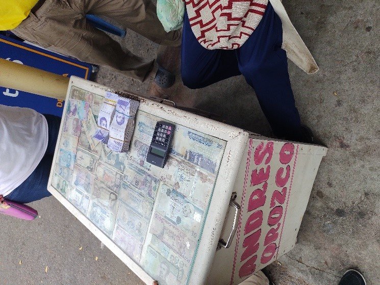 Pares conversó con uno de los intercambiadores de divisas, quien manifestó que los migrantes venezolanos en el exterior consignan en dólares a sus familiares que siguen en Venezuela. Adicionalmente, quienes ya residen en Colombia ahora prefieren cambiar pesos por dólares y no por bolívares. Quienes llegan a la frontera y deciden cruzar hacia el lado venezolano tienen la posibilidad de cambiar pesos por dólares o bolívares en varios puestos (como en el que se ve en la imagen), donde el dólar puede estar cotizándose entre 3.500 pesos y 3.600 pesos colombianos. No obstante, uno de los intercambiadores entrevistado manifestó que, pese a que salen dólares de Colombia hacia Venezuela, la mayoría de dólares que se encuentran en estos puestos provienen del vecino país e ingresan a territorio colombiano, aprovechando la devaluación del peso colombiano con relación a la moneda estadounidense.
