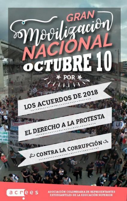 El nuevo llamado a las calles lo hicieron los universitario para hoy, jueves 10 de octubre, y esta esta vez fue convocada en el resto del territorio nacional y no solo en Bogotá. Voceros de los estudiantes insisten en que este nuevo llamado se da a raíz de los desmanes ocurridos durante las manifestaciones de las universidades Distrital, Pedagógica, Javeriana y Nacional en Bogotá, y la Universidad del Norte en el Atlántico, así como la falta de garantías del derecho a la protesta. La defensa de la autonomía universitaria, contra la corrupción en las instituciones educativas y la protesta pacífica por la defensa de la educación con financiación son las tres consignas de este jueves.