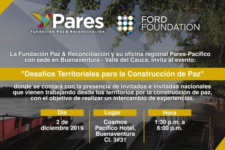 La Fundación Paz & Reconciliación y su oficina regional Pares-Pacífico, ubicada en el Distrito de Buenaventura, realizó con éxito el evento «Desafíos Territoriales para la Construcción de Paz» con apoyo de la FORD FUNDATION, el pasado lunes 02 de diciembre en las instalaciones del Hotel Cosmos Pacífico de la ciudad-puerto de Buenaventura (Valle del Cauca).