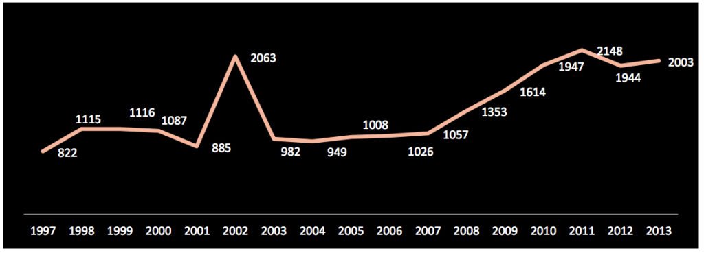 Evolución anual de las acciones de las Farc- 1997-2013