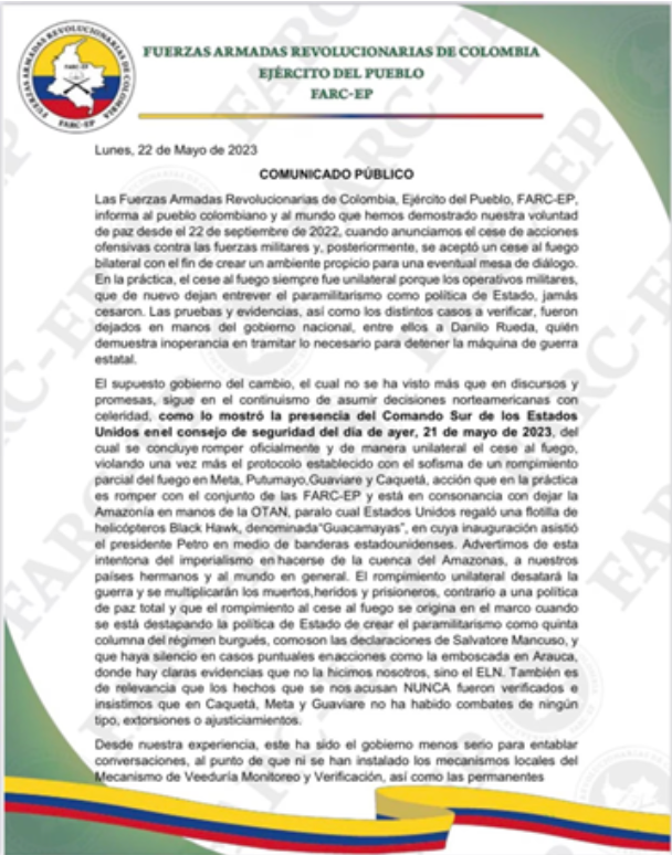 En consecuencia, el grupo armado emitió un comunicado en el cual afirma que el Estado Mayor Central (EMC) ha demostrado desde el 22 de septiembre de 2022 su voluntad de paz, fecha en la que se anunció el cese de acciones ofensivas contra la Fuerza Pública con el objetivo de crear un ambiente propicio para una eventual mesa de diálogo. Sin embargo, en un informe de inteligencia militar divulgado por W Radio, se evidenció que este grupo habría violado el cese al fuego con 226 acciones violentas, acciones que han afectado principalmente a los departamentos del Cauca, Meta, Nariño, Valle, Caquetá y Norte de Santander.