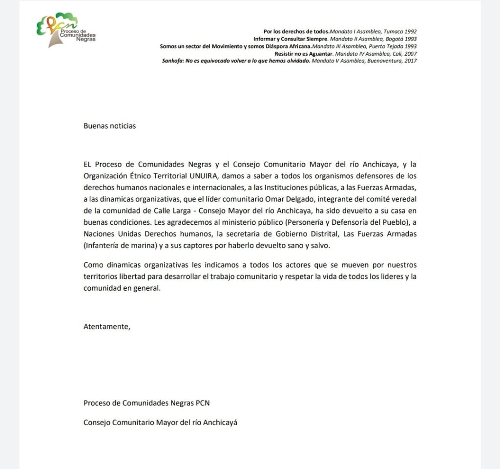 Mediante un comunicado del Proceso de Comunidades Negras, el Consejo Comunitario Mayor del río Anchicaya y la organización Étnico Territorial UNUIRA informaron que el líder comunitario Omar Delgado afortunadamente fue devuelto a su casa en buenas condiciones.