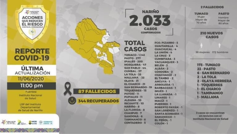 Según el Instituto Departamental de Salud de Nariño, IDSN, Tumaco tiene a la fecha del 11 de junio el 56,22% de los casos reportados en el departamento, con la dolorosa cifra de 1.143 personas contagiadas, siendo el municipio con mayor propagación del virus (Instituto Departamental de Salud de Nariño, 2020)