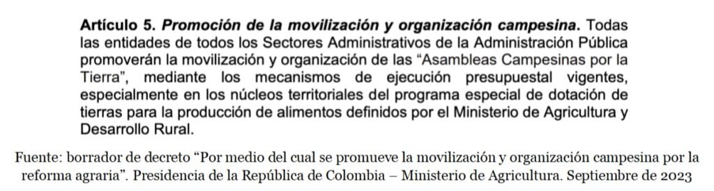 El pasado martes 05 de septiembre, la Presidencia de la Repúblicapublicó en su página web un borrador de un decreto que busca que el campesinado se organice en “Comités Municipales para la Reforma Agraria” a nivel local y “Asambleas Campesinas por la Tierra” a nivel regional, con la finalidad de que estos espacios puedan funcionar como escenarios participativos para construir e implementar las políticas de reforma agraria y hacer control social o veedurías del proceso y sus resultados, además de motivar la movilización campesina.
