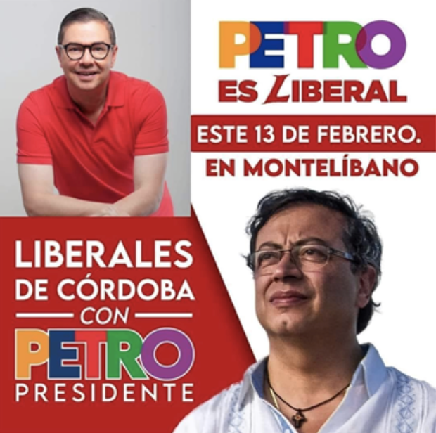 El 13 de febrero, Gustavo Petro asistió a un evento político en Montelíbano organizado porGabriel Calle Aguas , hermano del representante a la Cámara y heredero político del Clan Calle, Andrés David Calle Aguas. En este encuentro le fue entregada la bandera del Partido Liberal al candidato presidencial y fue anunciada la alianza de la lista del Partido Liberal a la Cámara en Córdoba con la lista presidencial del Pacto Histórico.